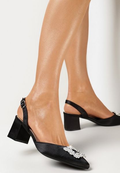 Czarne Satynowe Sandały z Biżuteryjną Klamerką i Noskiem w Szpic Vovi