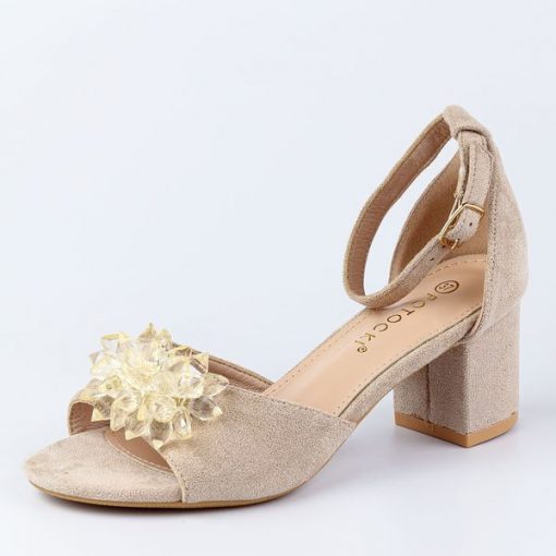 Beżowe zamszowe sandały damskie na obcasie z kryształami Potocki 20019