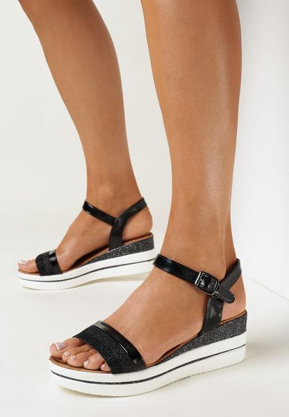 Czarne Sandały na Piankowym Koturnie z Brokatem Forana