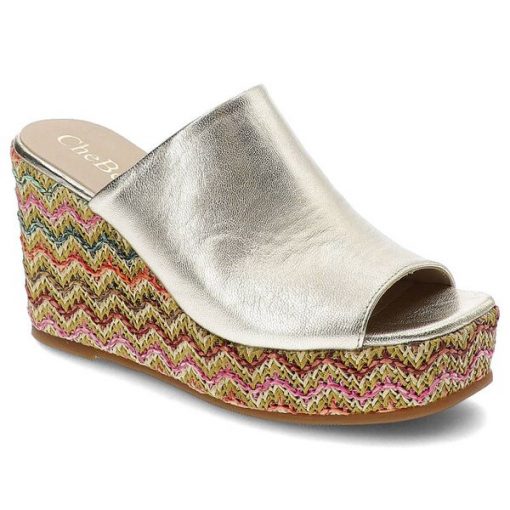 Złote klapki CHEBELLO – 4100_-454-000-PSK-S277 Złoty to nadzwyczajne buty dla wyrafinowanej kobiety. Nieziemska cholewka została uformowana ze skóry naturalnej licowej. Skrupulatnie utkany obcas nadaje całości niezwykle oryginalny charakter. Wnętrze oraz wkładka ze skóry naturalnej zapobiegają rozwojowi bakterii i grzybów. Damskie klapki CHEBELLO – 4100_-454-000-PSK-S277 Złoty