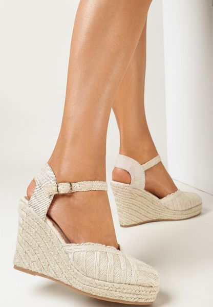 Beżowe Plecione Sandały na Wysokim Koturnie ze Sprzączką Velisan