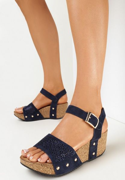Niebieskie Sandały na Koturnie z Korka i Nitami z Ażurowym Paskiem Navela