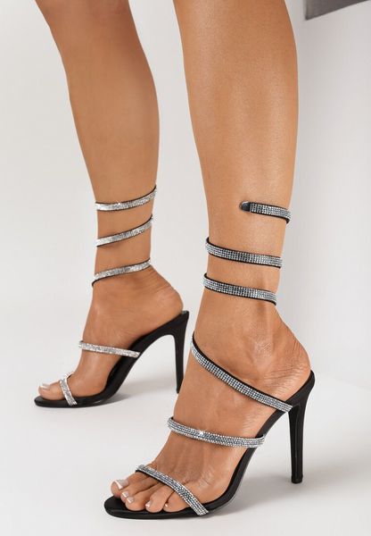 Czarne Sandały w Cyrkonie na Szpilce z Paskiem Sprężyną Chasdiela