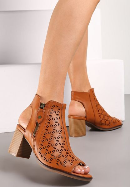 Tęgość stopy: Neutralny, Rodzaj obcasa: Słupek, Wkładka/wyściółka: Ekoskóra, Materiał: Ekoskóra, Nosek buta: Otwarty, Zapięcie: Zamek błyskawiczny, Sezon: Letni, Kod produktu: 296608, Kolor: Brązowy