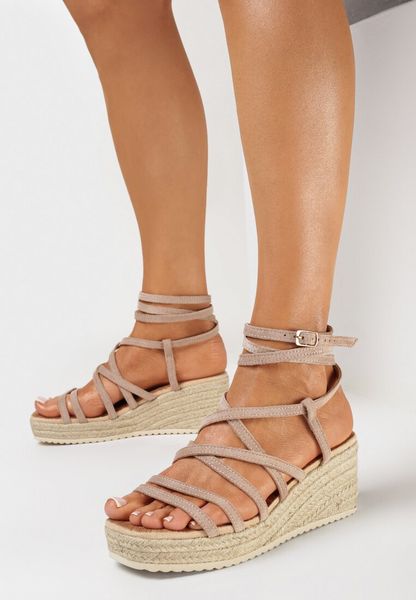 Ciemnobeżowe Sandały na Koturnie z Ozdobnymi Paseczkami Alumina