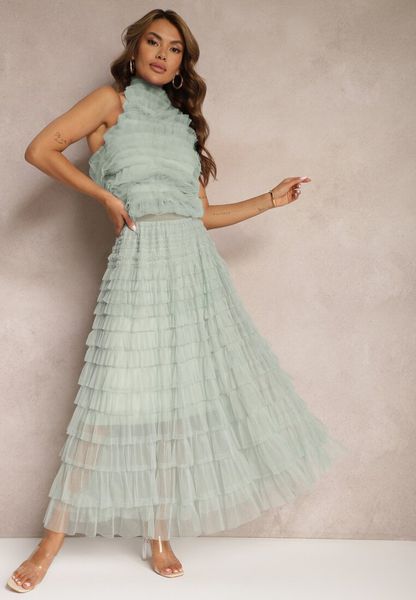 Miętowa Spódnica Tiulowa z Gumką w Talii Ozdobiona Falbanami Missalisha
