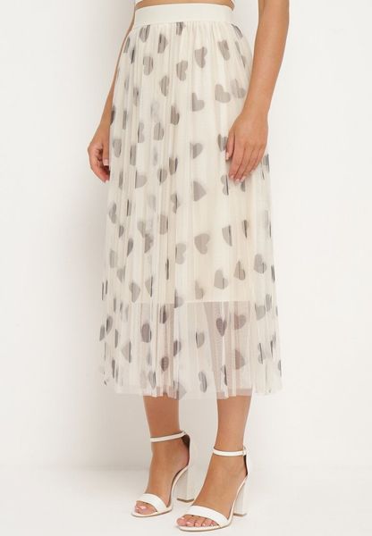 Beżowa Plisowana Tiulowa Spódnica z Gumką w Pasie i Aplikacjami Serduszkami Missalica