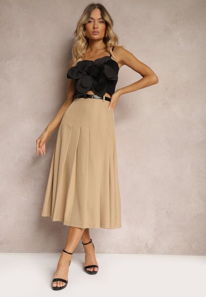 Beżowa Spódnica High Waist o Plisowanym Kroju z Paskiem w Talii Xeviana