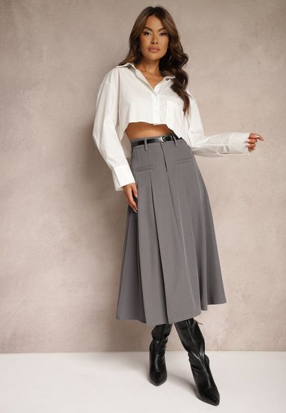 Szara Spódnica o Rozkloszowanym Kroju High Waist z Paskiem i Imitacją Kieszeni Rivivia