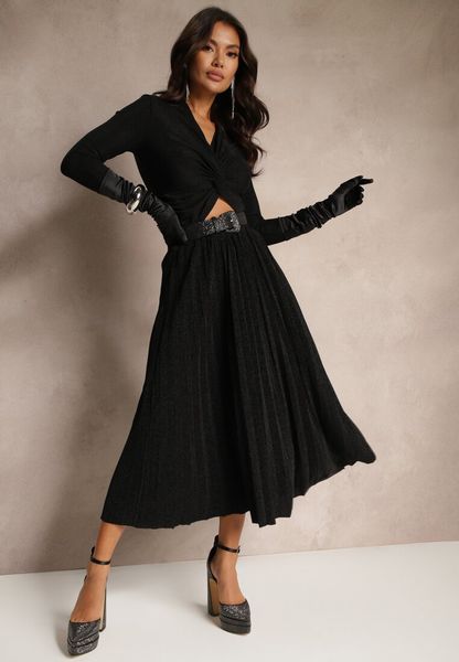 Czarna Połyskująca Spódnica o Rozkloszowanym Kroju z Gumką w Pasie i Plisami Edalliana