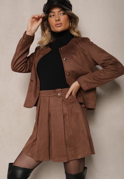 Brązowa Rozkloszowana Spódnica z Ekozamszu z Plisami w Stylu Preppy Sealia