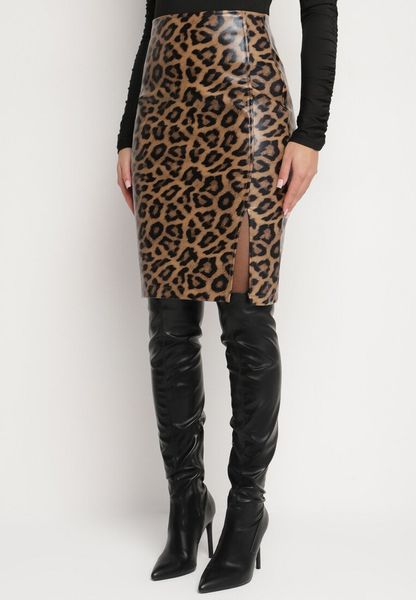 Brązowa Spódnica Ołówkowa w Panterkę z Rozcięciem na Nogę Tamornis