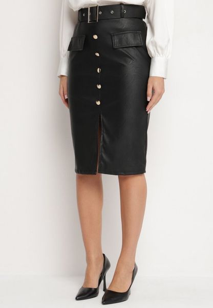 Czarna Ołówkowa Spódnica z Wysokim Stanem z Ekoskóry z Ozdobnym Paskiem Velinka
