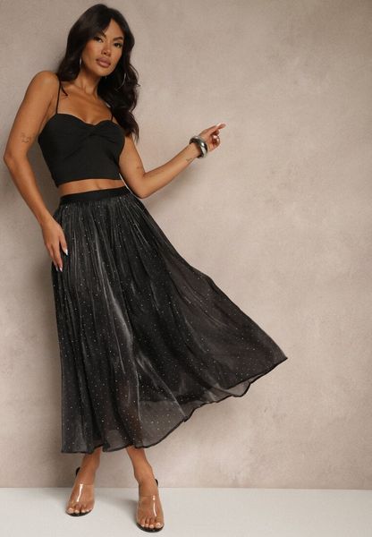Czarna Spódnica o Rozkloszowanym Kroju z Ozdobnymi Cyrkoniami Folaressa
