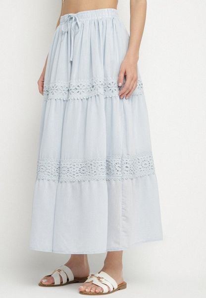 Jasnoniebieska Spódnica z Wiskozą o Rozkloszowanym Kroju z Koronkowym Zdobieniem Banilea