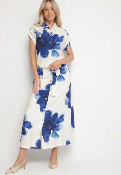 Niebieska Spódnica z Wiskozy w Kwiaty z Wysokim Stanem Guzikami i Paskiem Zelseli