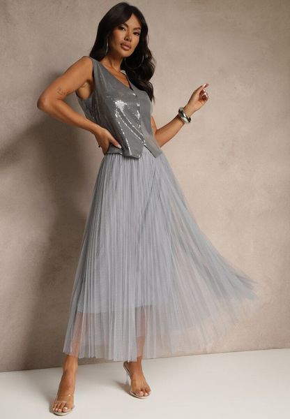 Ciemnoszara Rozkloszowana Spódnica z Tiulu w Kropki Folemia