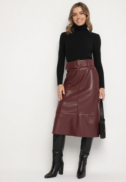 Bordowa Trapezowa Spódnica z Imitacji Skóry z Paskiem z Okrągłą Klamrą Salendia