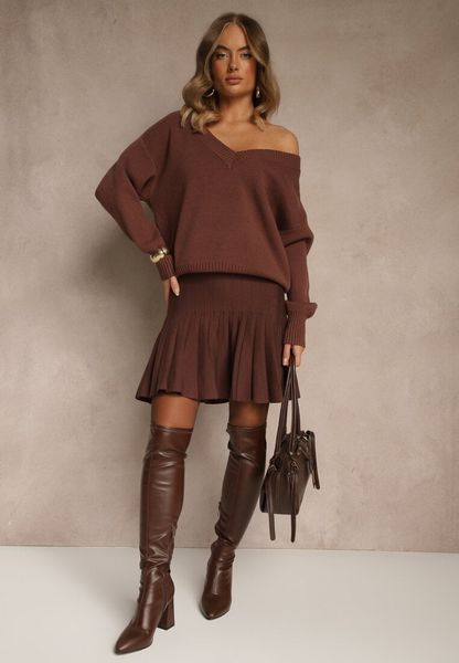 Brązowa Spódnica z Wiskozą o Rozkloszowanym Kroju High Waist Calatiela