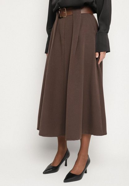 Brązowa Rozkloszowana Spódnica z Wiskozą Zdobiona Paskiem z Klamrą Tinevia