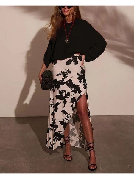 – wysokość pasa: high waist- zapięcie: boczny suwak- dolny brzeg: z rozcięciem- krój: luźny- wzór: kwiatowy