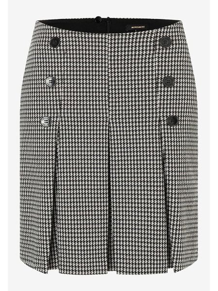 – wysokość pasa: high waist- zapięcie: suwak z tyłu- detale: ozdobna zakładka, ozdobne guziki- krój: prosty- wzór: pepitka