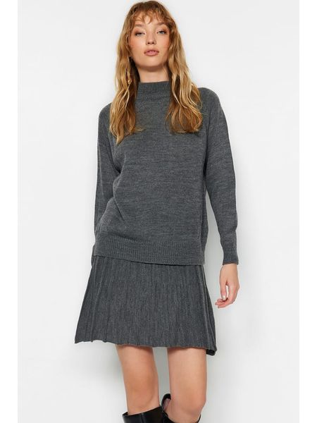 W zestawie:- sweter- spódnicaSweter:- kołnierz: stójka- ściągacz: dekolt, zakończenia rękawów, dolny brzeg- krój: prosty- wzór: melanżowySpódnica:- pas / ściągacz: elastyczny- krój: rozkloszowany- wzór: melanżowy