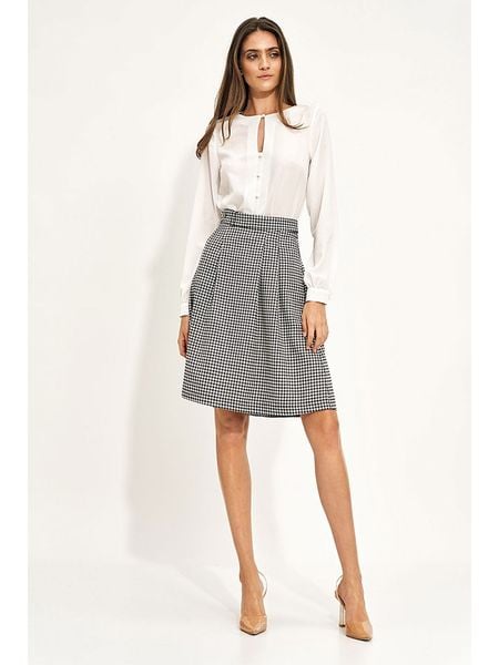 – wysokość pasa: regular waist- zapięcie: suwak z tyłu- detale: ozdobny guzik- krój: litera A- wzór: pepitka