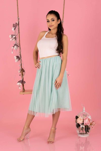 Plisowana Tiulowa Midi Spódnica na Gumie -Miętowa