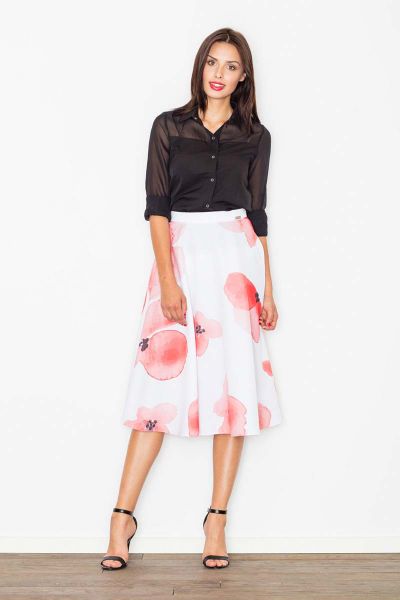 Spódnica Midi Rozkloszowana w Kolorowe Kwiaty w Odcieniach Różu