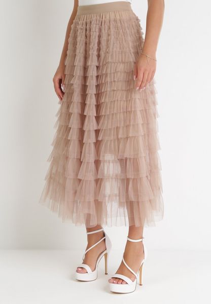 Ciemnobeżowa Rozkloszowana Spódnica z Tiulowymi Falbankami i Gumką w Pasie Keleia