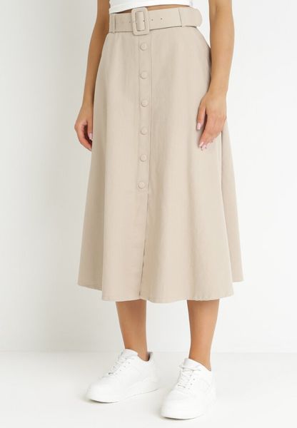 Jasnobeżowa Rozkloszowana Spódnica Midi z Ozdobnymi Guzikami i Materiałowym Paskiem z Bawełny Margareta
