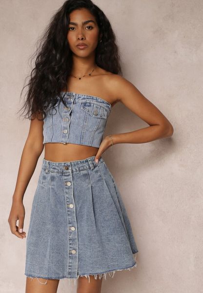Niebieska Jeansowa Spódnica Mini z Zakładkami Hollette
