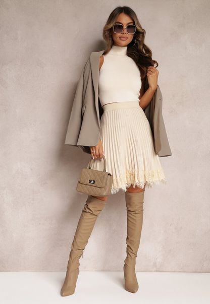 Jasnobeżowa Spódnica Mini Rozkloszowana z Gumką w Talii Saniurio
