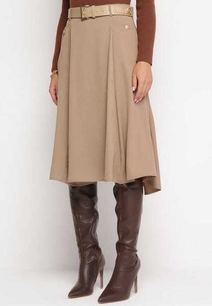 Beżowa Rozkloszowana Spódnica z Paskiem z Ekoskóry Fortensja