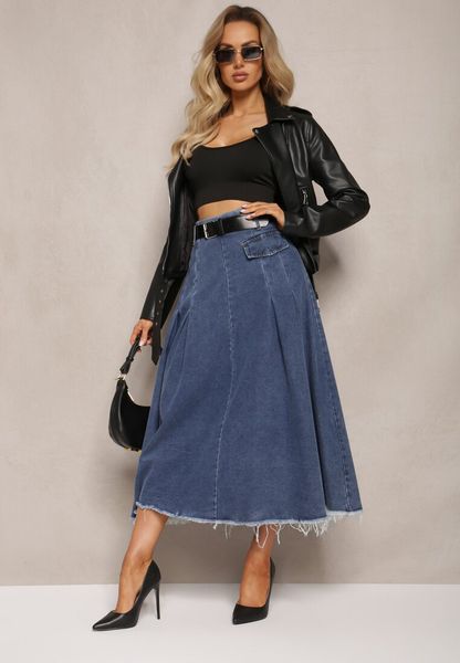 Spódnica jeansowa Grinna o długości midi o rozkloszowanym fasonie z lekko postrzępioną dolną krawędzią. Dodatkowym atutem jest pasek z ekoskóry dołączony w komplecie. Pasuje zarówno do sneakersów, jak i sandałów na obcasie.