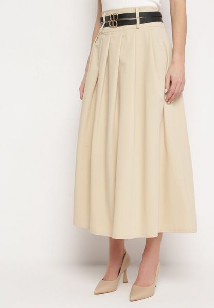Jasnobeżowa Spódnica z Podwójnym Paskiem z Ekoskóry i Szerokimi Plisami Hiritai