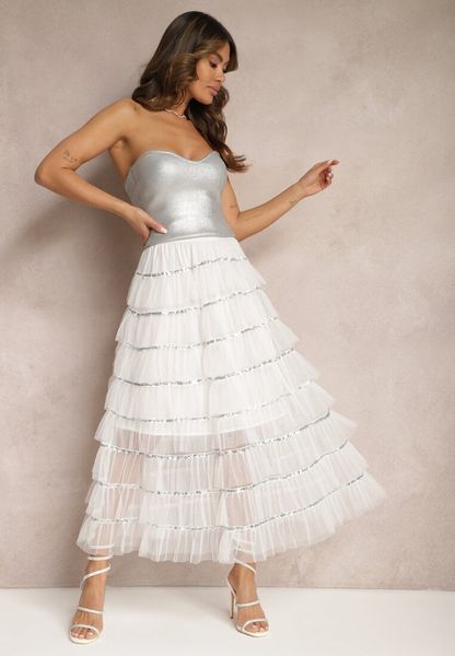 Biała Rozkloszowana Spódnica Maxi z Falbankami i Cekinami Noobi