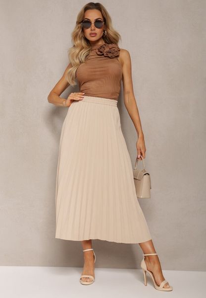 Beżowa Rozkloszowana Spódnica High Waist z Ozdobnymi Plisami i Gumką w Pasie Veratia