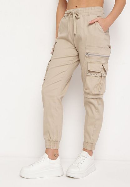 Beżowe Spodnie Typu Bojówki z Bawełny z Gumką w Pasie i Kieszeniami Quera