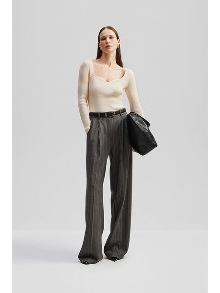 – wysokość pasa: high waist- zapięcie: haczyk i suwak- szlufki na pasek: tak- kieszenie: wpuszczane i tylne- zakończenia nogawek: dzwony- krój: prosty- wzór: paski