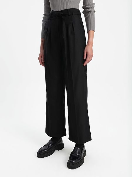 – wysokość pasa: high waist- fason: comfort fit- krój nogawek: szeroki- szlufki na pasek: tak- zdejmowany pasek: tkanina- zapięcie: guzik i suwak- kieszenie: wpuszczane- detale: kant- look: jednokolorowyUwaga: Przy wyborze właściwego wariantu zaleca się korzystanie z tabeli rozmiarów.