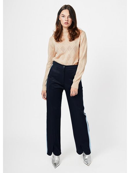 – wysokość pasa: high waist- fason: regular fit- krój nogawek: prosty- zapięcie: haczyk i suwak- kieszenie: wpuszczane- zakończenia nogawek: z rozcięciem- detale: kontrastujące paski- look: jednokolorowy