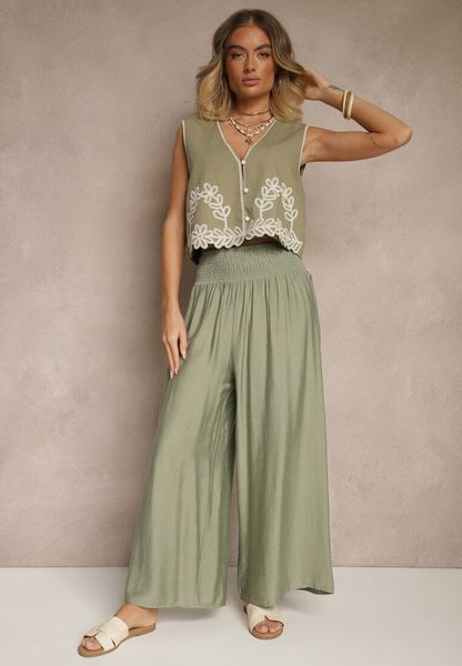 Jasnozielone Spodnie z Wiskozą o Szerokim Kroju High Waist Orrana