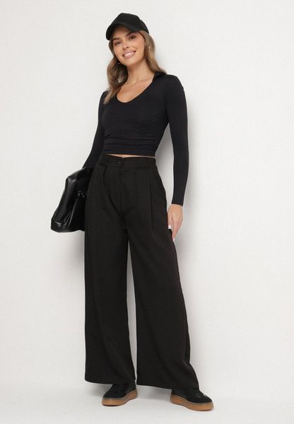 Czarne Szerokie Palazzo Spodnie z Wysokim Stanem Zapinane na Zamek i Guziki Folina