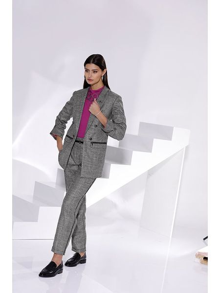– wysokość pasa: high waist- krój nogawek: prosty- szlufki na pasek: tak- zapięcie: haczyk i suwak- kieszenie: wpuszczane i tylne- wzór: melanżowyUwaga: Przesyłka nie zawiera paska.Uwaga: Tylko opisany produkt wchodzi w skład przesyłki.