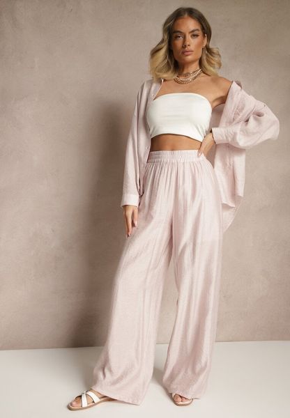 Jasnoróżowe Spodnie Palazzo o Szerokim Kroju z Gumką w Pasie i Wysokim Stanem Jenanetia