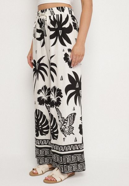 Czarno-Beżowe Spodnie z Tropikalnym Wzorem i Szerokimi Nogawkami Emivelli