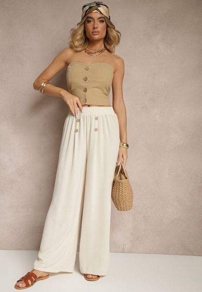Jasnobeżowe Spodnie z Bawełną o Szerokim Kroju High Waist Ozdobione Guzikami Morritia