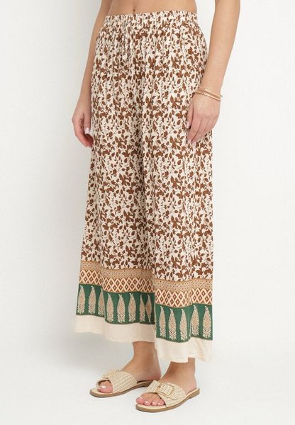 Brązowe Bawełniane Spodnie z Wysokim Stanem o Długości 7/8 ze Wzorem Boho Lisavinea